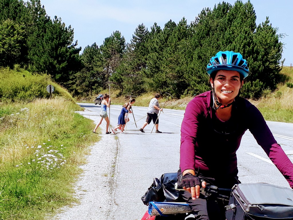 Foto di gruppo per salutare la famiglia che ci ha ospitate a pagamento e via verso il prossimo parco naturale, la strada inizia in piano per fortuna, così ci scaldiamo un po’ prima della salita.
