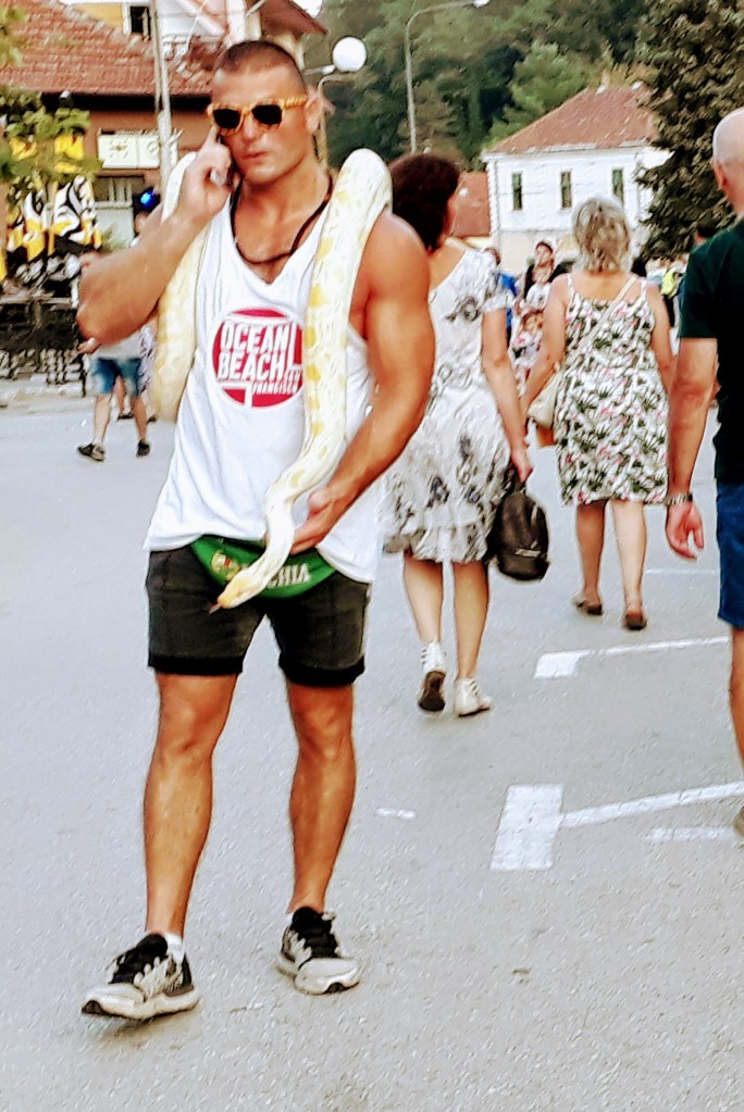 Parata per la presentazione delle nozze tradizionali del Dragacevo, la regione in cui ci troviamo. Le band suonano tutte contemporaneamente cercando si sovrastarsi a vicenda. Un bordello inaudito, un sole cocente, cappelli di pelliccia ed erti calzini di lana.