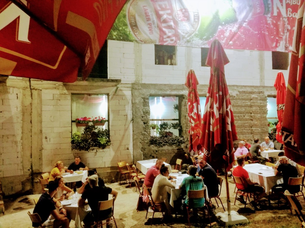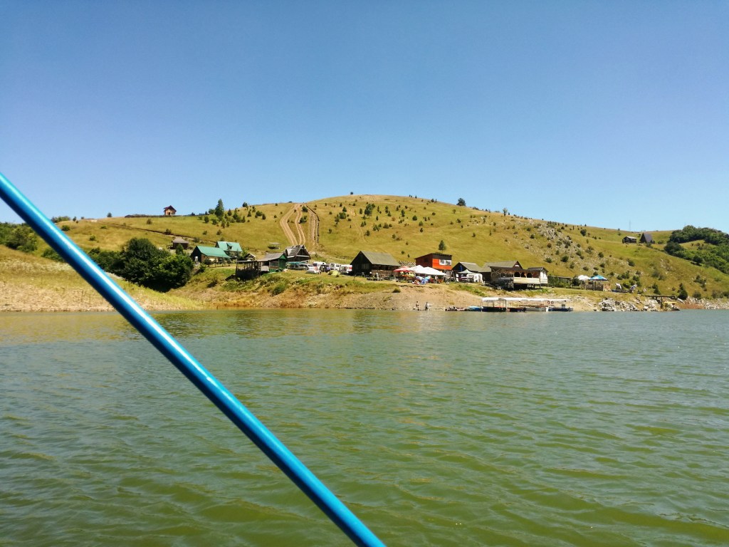 Ci apparecchia la tavola nel suo ristorante, un prefabbricato in legno che affaccia sul lago, chiuso per tutti tranne che per noi. Ci guarda mentre mangiamo e chiacchiera con noi. In un serbo molto espressivo. Mi sembra di capirlo. Arriva il momento della rakija a cui non si può dire di no. Finisce il momento della rakija perché noi, stanchissime, vorremmo andare a letto e non ce la facciamo più ad ascoltarlo. E invece no, eccoci sedute di nuovo a mangiare una pesca noce che, pare, sia essenziale per neutralizzare l’alcool di questa bevanda che sa di spirito e ti punge in gola. Ovviamente ci accompagna in tenda e ci rimbocca le coperte, ci manca poco che si sdrai beatamente con noi. Serate così valgono il viaggio intero.