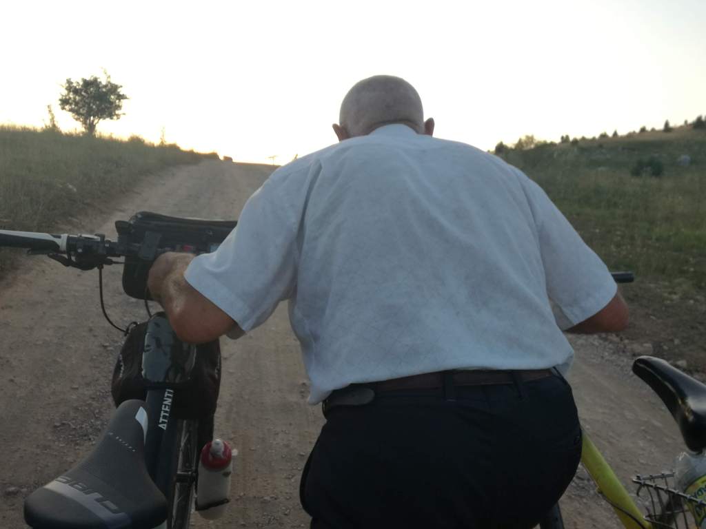 Ecco un altro bell’uomo attempato, questo qualche dente in più ce l’ha, che mi aiuta a spingere la bici in salita sull’ultimo tratto di sterrato. All’inizio faccio la dura, non perché sono donna ho bisogno d’aiuto, poi, spompata, cedo e lo ringrazio. Eider va, non sembra aver bisogno di spinte e si guadagna il nuovo soprannome di “trattore”.