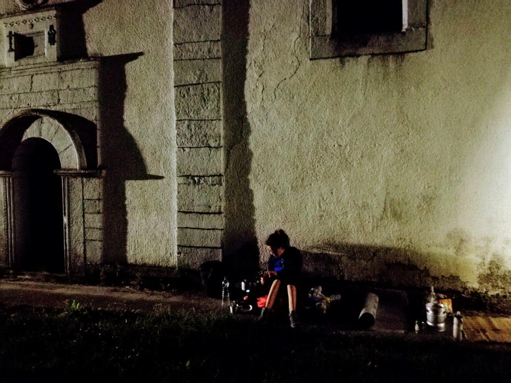 Quale miglior posto per dormire del prato verde e liscio di una chiesetta/cimitero sulla collina? Non ne capiamo bene il motivo, ma accamparci accanto ad una chiesa ci rassicura, se qualcuno passasse da queste parti, sarebbe comprensivo e compassionevole, pensiamo. E poi c’è anche la fontanella per i morti. L’acqua è vita.