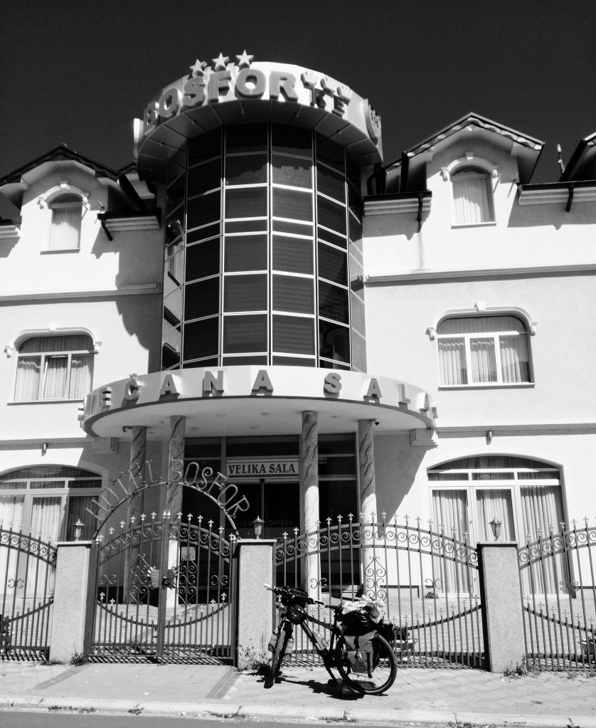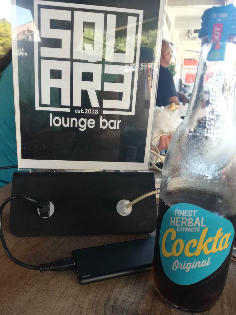 Per entrare in Kossovo ci aspetta una bella salita, aspettiamo che passino le ore più calde in questo lounge bar stramoderno, con tanto di caricabatterie da tavolo e la Cockta. La finta Coca Cola locale più sana, più buona e più etica di quella originale.