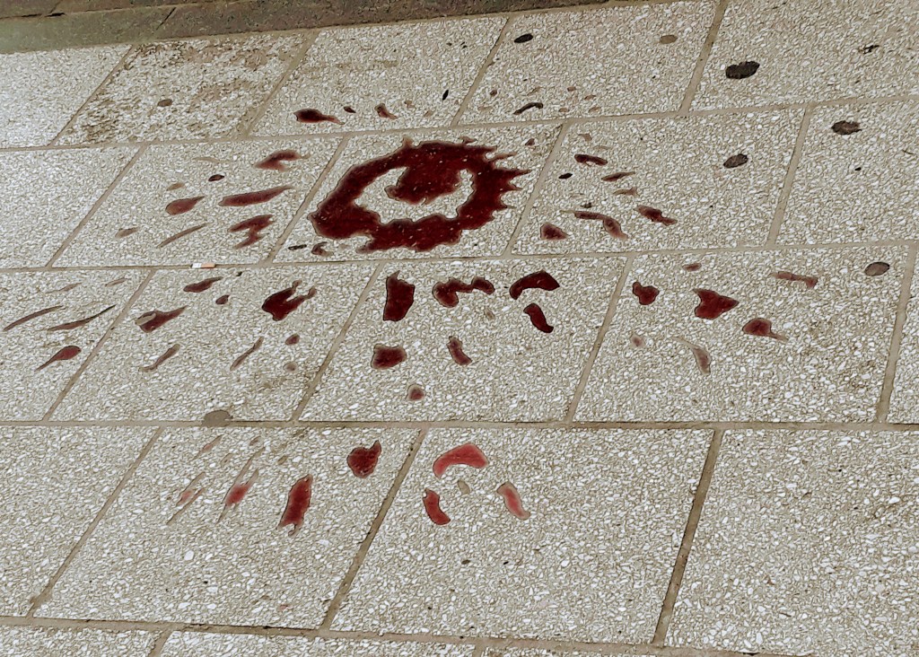 Ci si imbatte in numerose macchie come questa per le strade di Sarajevo. Stanno a simboleggiare i punti più importanti in cui sono cadute le granate. Questa esplose vicino alla panetteria mentre alcuni civili stavano facendo la fila per il pane durante la guerra.