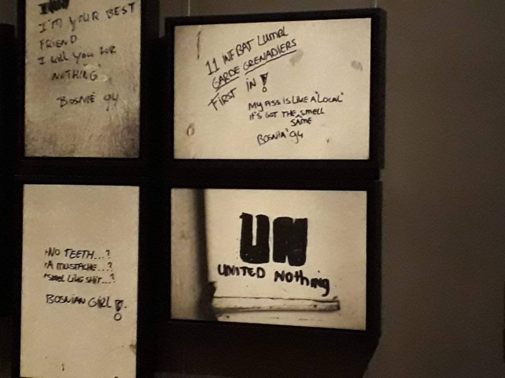 Orribili e vergognosi graffiti trovati nel campo base olandese di Potocari. Questa sottospecie di esseri umani che aveva il compito di proteggere le persone che qui scherniscono per iscritto. Mi fa senso anche tradurre queste frasi.