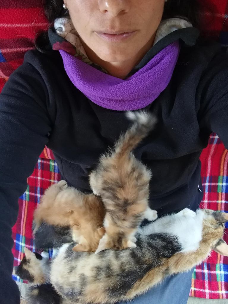 Niente, ci riposiamo un po’, si sta bene. Non si convince del tutto fino a quando scopre di aver bucato una ruota. Quindi sì, dai fermiamoci. Deo gratias! Comunque non mi sarei mossa, tanto più che la strada prosegue tutta in salita.
