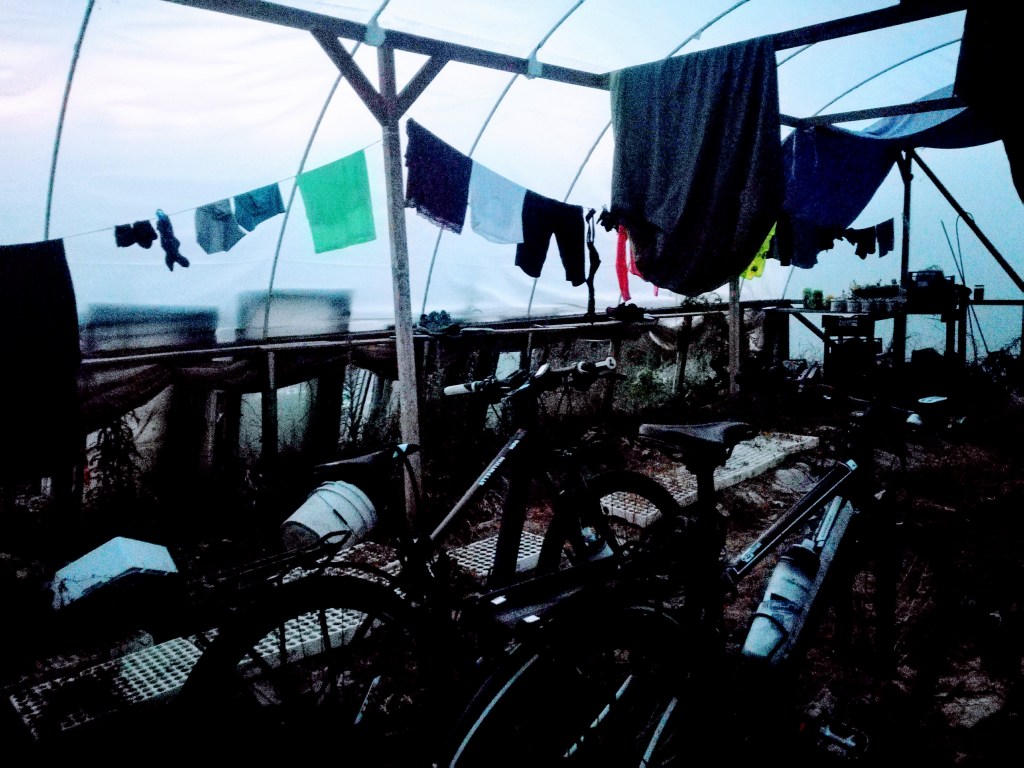 Il sole sta tramontando, si pedala con gusto a quest’ora. Tutto diventa più romantico. Non ci sono campeggi né stanze in affitto, ci appropinquiamo quindi a cercare un prato su cui piantare la tenda, sarebbe perfetto vicino al fiume, che è totalmente secco, pazienza. Niente male davanti a questa casa abbandonata. È chiaro che sia abbandonata, la macchina è senza targa, i muri vecchi, il grande prato antistante completamente incolto.