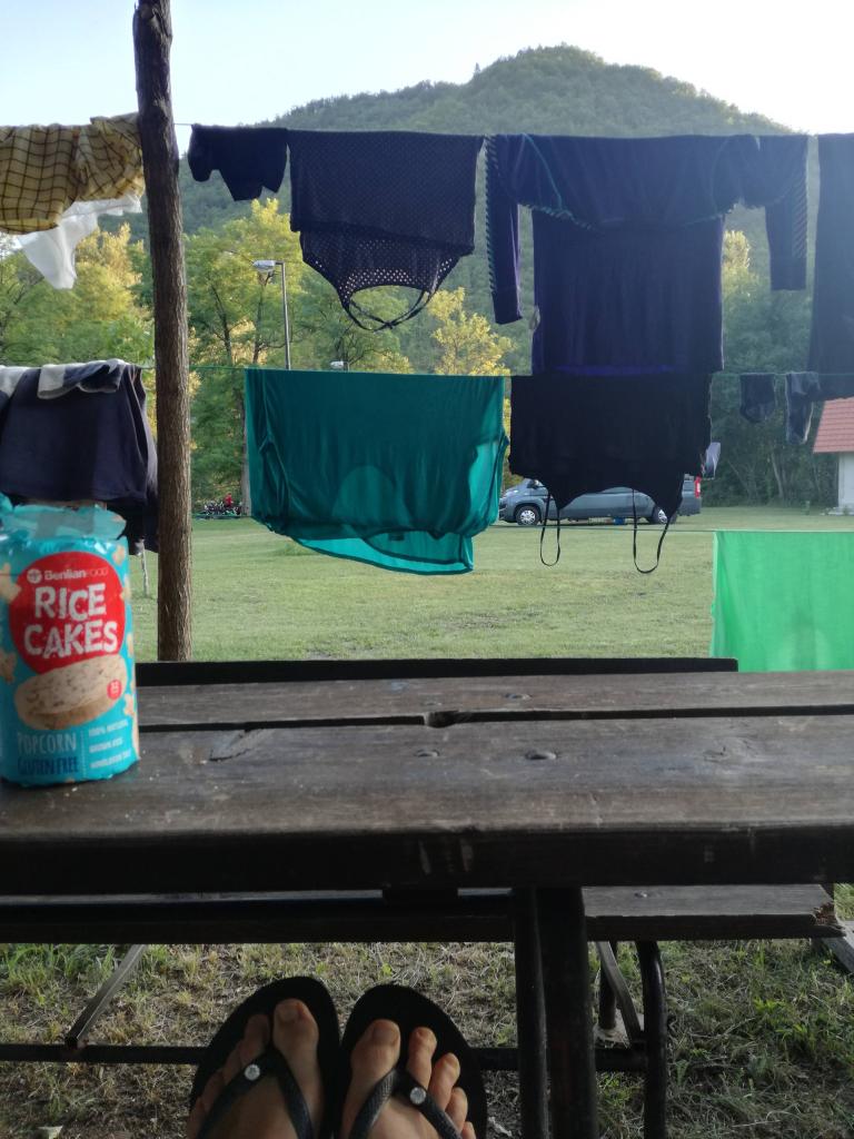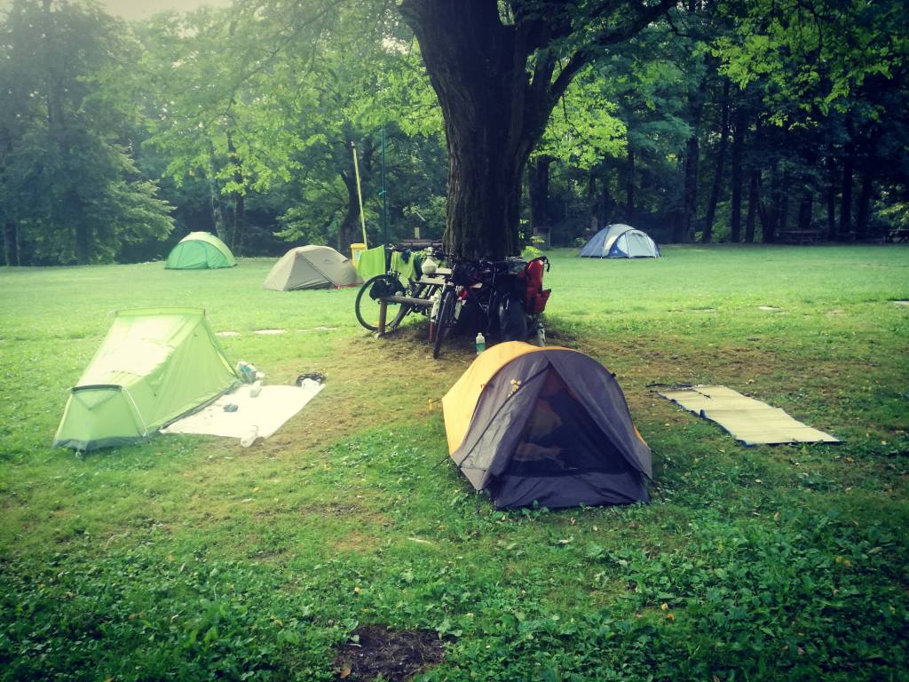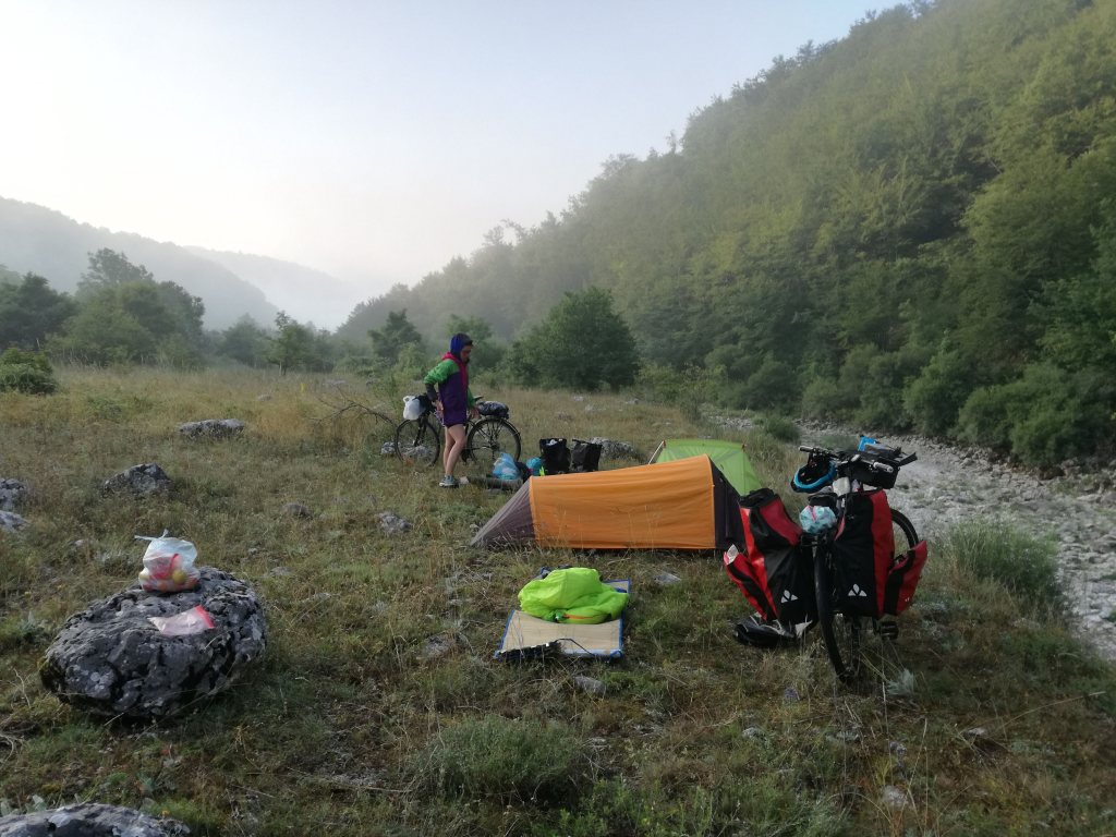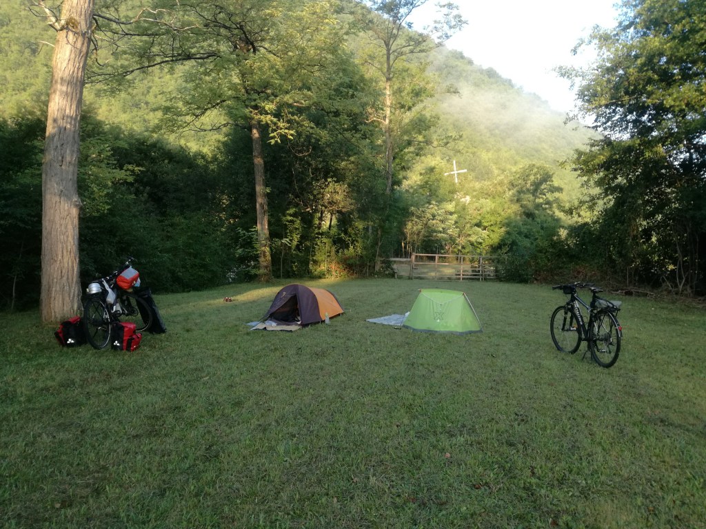 Alla ricerca di un posto per la notte. Trovato un campo vicino al fiume proprio qui dietro. Nascoste ma non troppo, spieghiamo con gesti alla famigliola che passa che siamo venute in bici “bicikl” – la trovo bella questa parola – da Spalato e siamo dirette a Višegrad. Quasi non abbiano mai visto delle tende da campeggio, ci fanno segno: “Qui? Dormire? Vi morirete di freddo.”