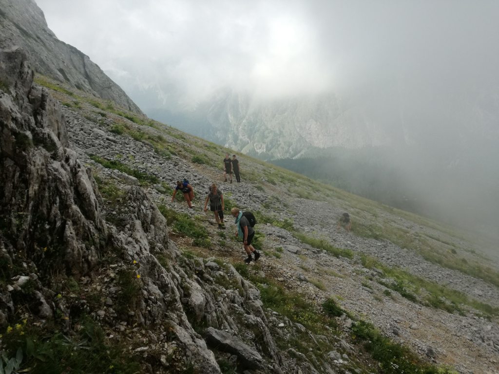 Una piccola mandria di cinque giovani olandesi dalle scarpe lisce, li voglio proprio vedere su quelle rocce viscide con quelle suole, parte prima di noi. Li troviamo poco dopo sbragati sulla pietraia all’inizio della salita, incerti sul come proseguire e già stanchi, anche se non lo danno a vedere.