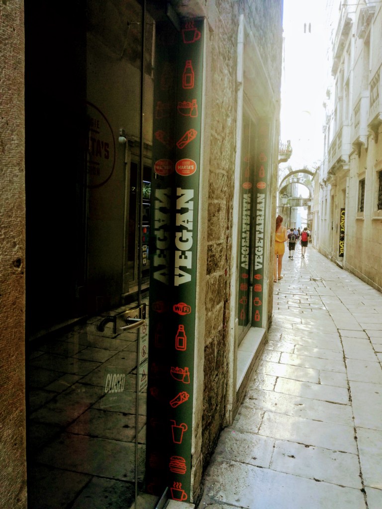 Cibo vegano, ho letto bene. Mi si illuminano gli occhi, mi si apre lo stomaco già mezzo pieno di pasta sfoglia e patate smaciullate. È chiuso, ho visto bene. Basta poco e il mondo diventa improvvisamente un luogo ostile.