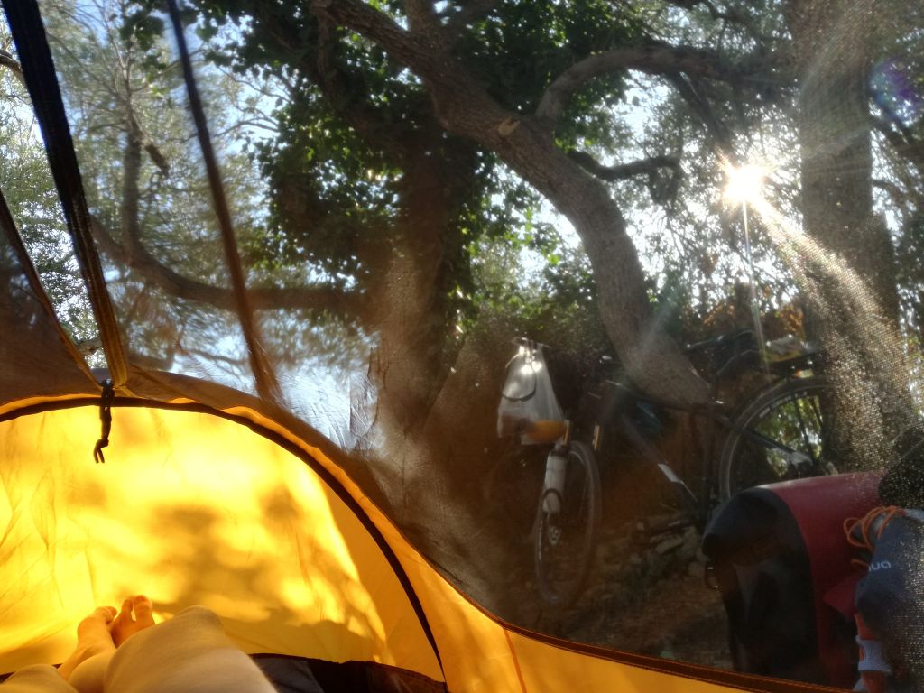 Spingendo sui pedali in salita, passo in rassegna tutto il materiale che mi sono portata e di cui avverto il peso. Perché mai riempire le borse con leggins, pile, doppio pile, anti pioggia, sacco a pelo pesante se ora mi sto letteralmente sciogliendo? Mi riposo un po’.